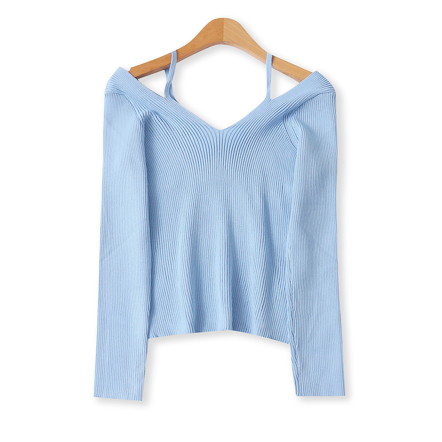 吊带露肩毛衣秋季新款外贸女装时尚V领修身高弹力螺纹针织衫18890