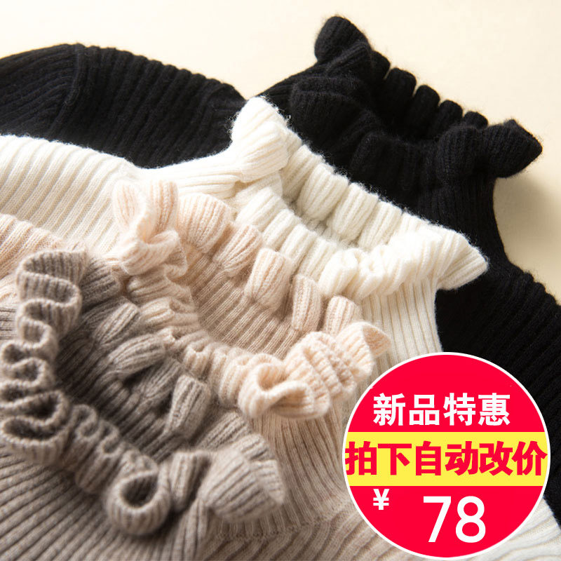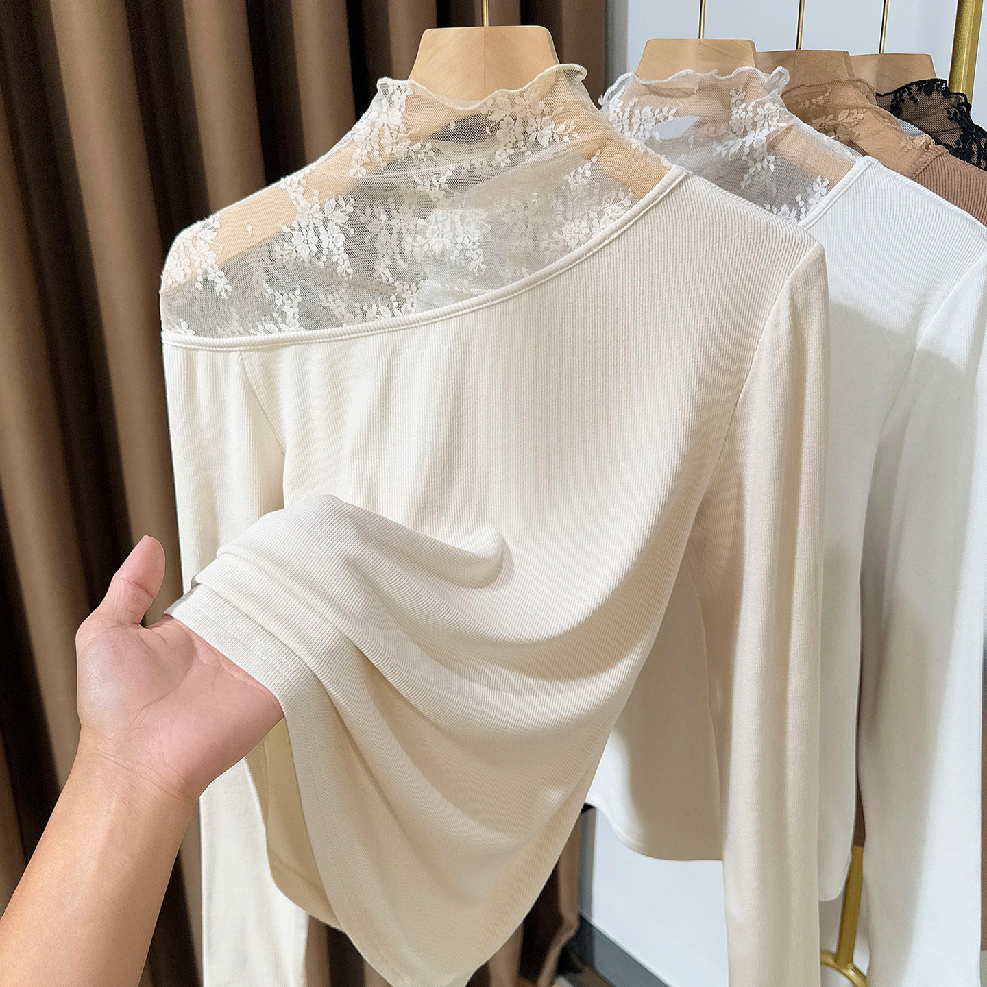 木耳边半高领蕾丝打底衫女拼接高级感螺纹针织衫磨毛内搭薄绒小衫