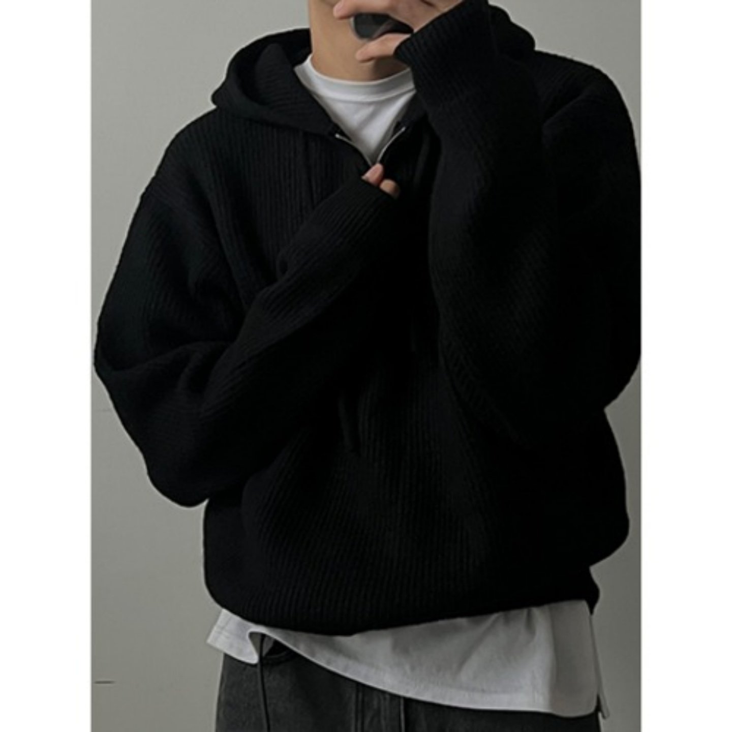 MRDONG韩国男装代购蓬松螺纹针织衫半拉链连帽落肩宽松慵懒风毛衣