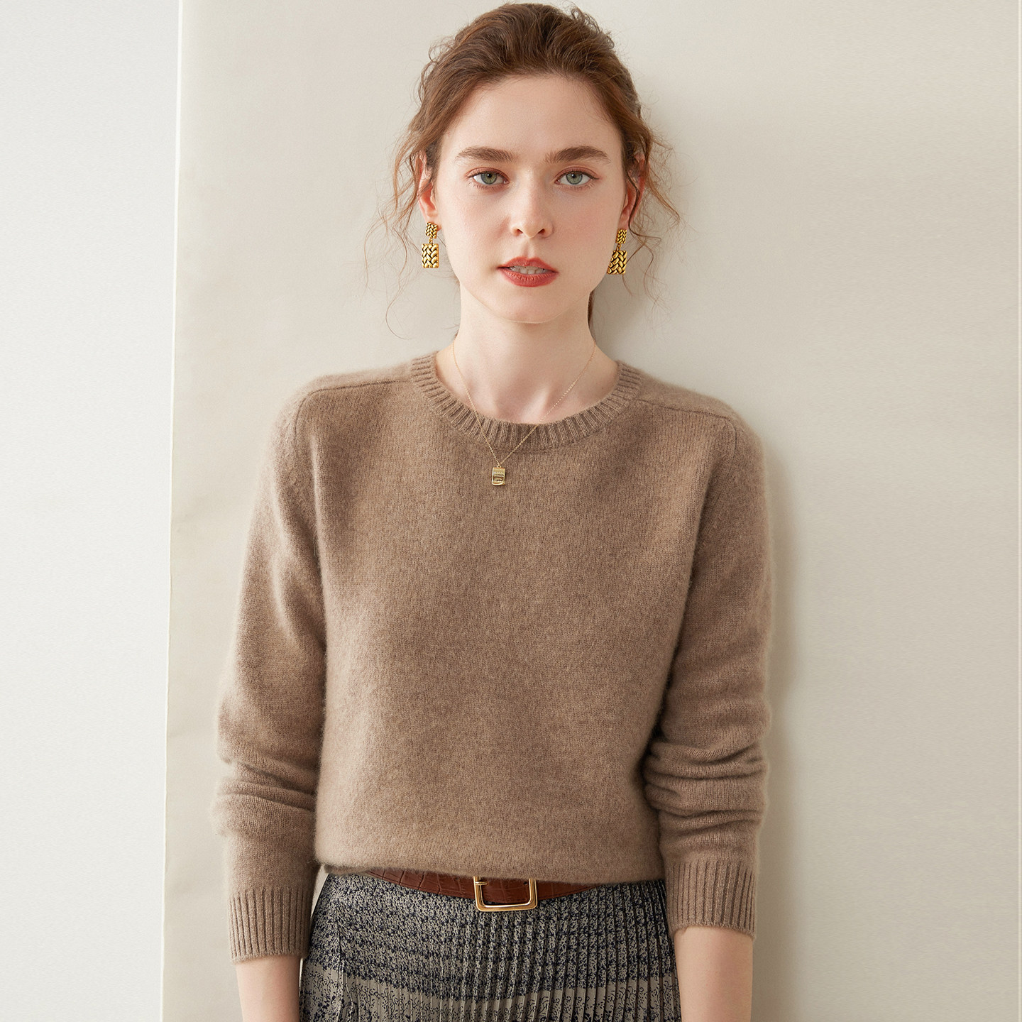 马鞍肩圆领山羊绒衫女套头螺纹针织衫秋冬款气质百搭显瘦打底毛衣
