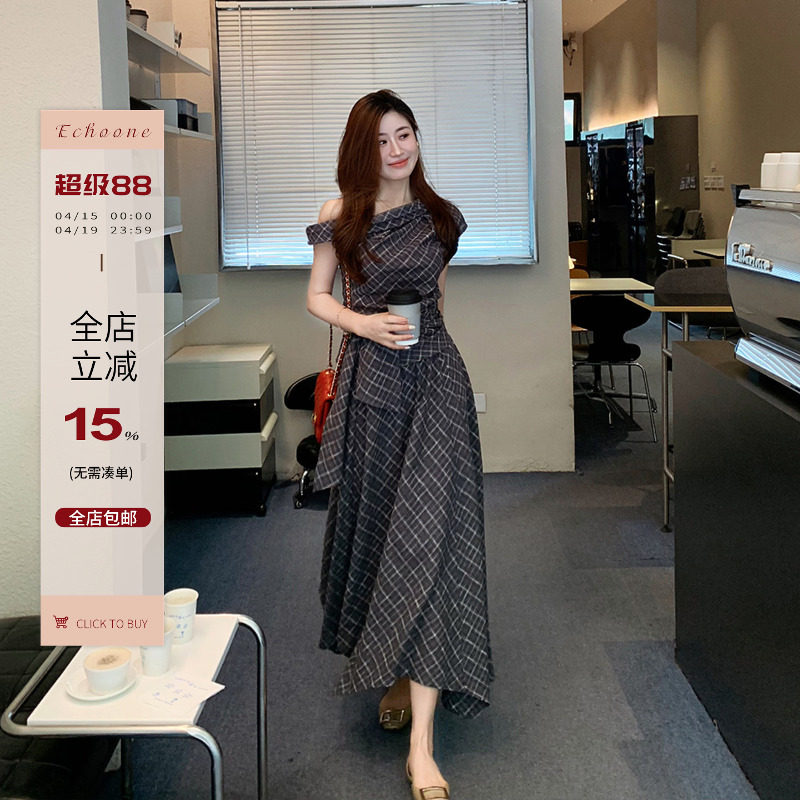 Echoone织木集 棉麻格纹套装女设计感绑带收腰斜肩上衣半身裙长裙