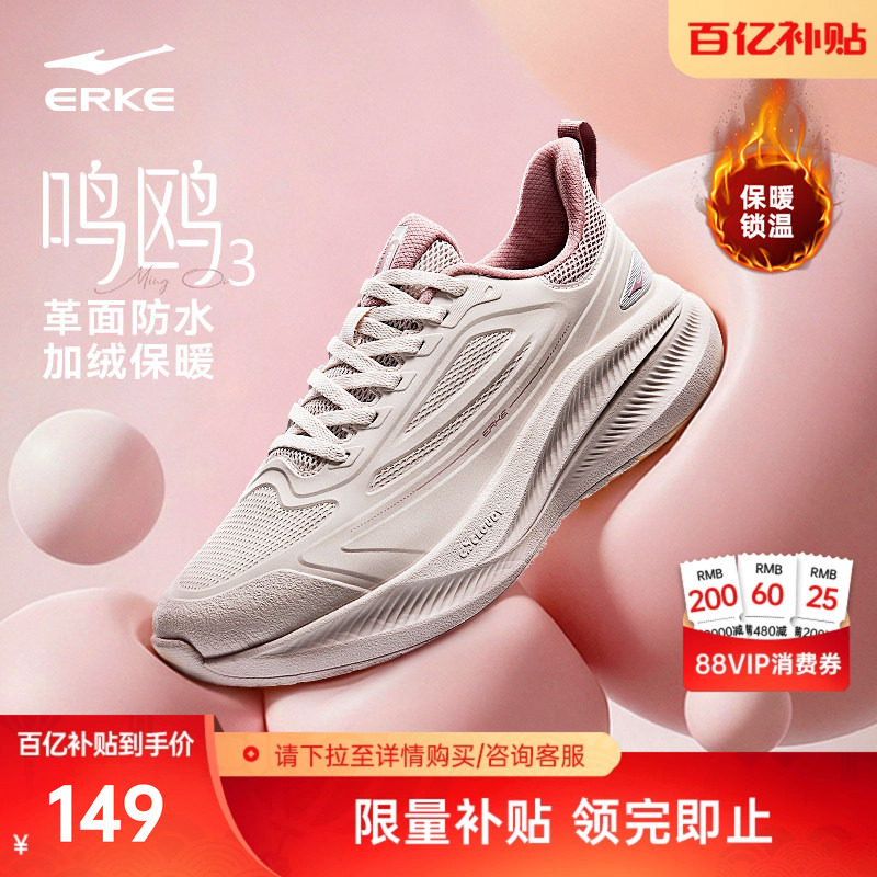 鸣鸥鸿星尔克运动鞋女鞋冬季新款加绒跑鞋轻便跑步鞋防水皮面鞋子