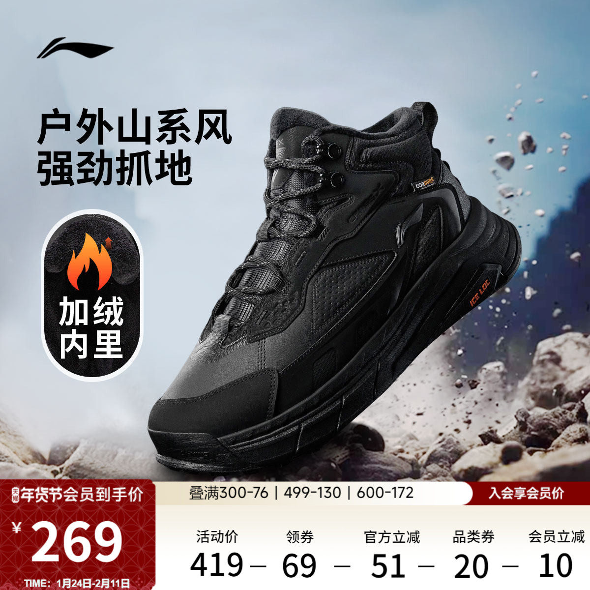 李宁星途2丨休闲鞋女鞋冬季新款情侣高帮加绒男鞋保暖棉鞋运动鞋