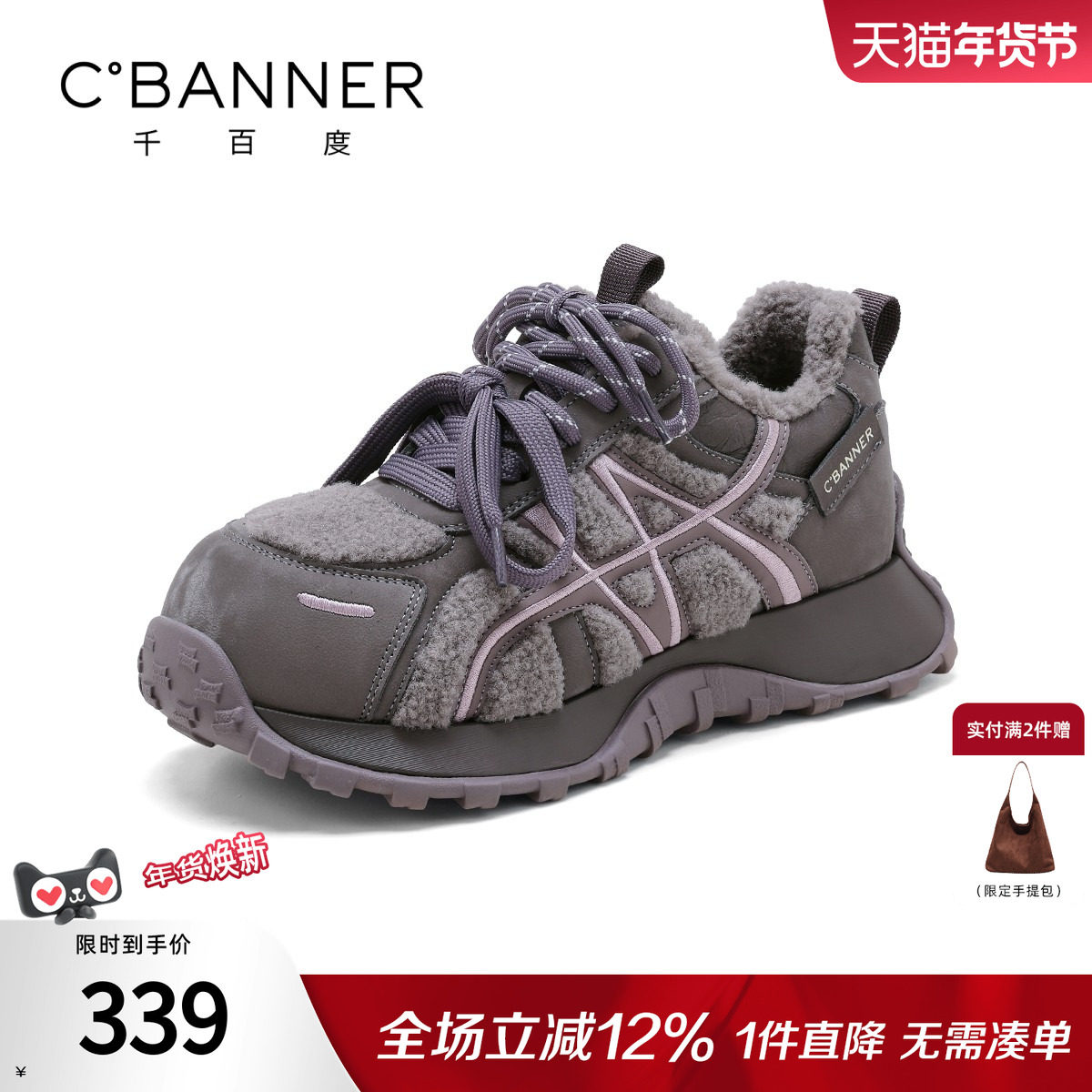千百度加绒阿甘休闲鞋女冬季2025新款厚底老爹鞋德训鞋百搭运动鞋