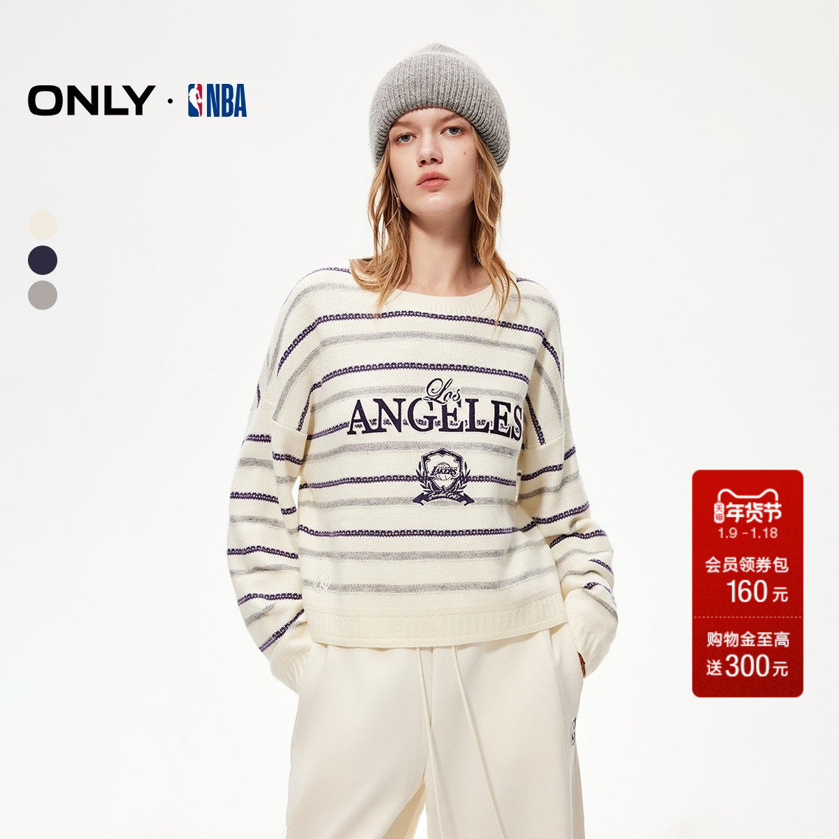 【NBA联名】ONLY2025冬季新款短款条纹羊毛混纺宽松落肩针织衫女