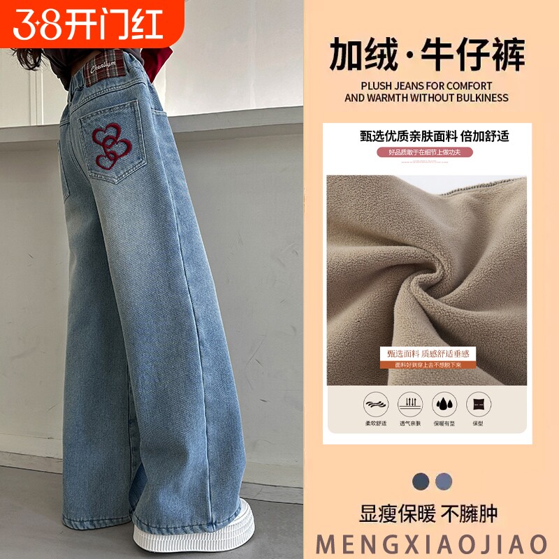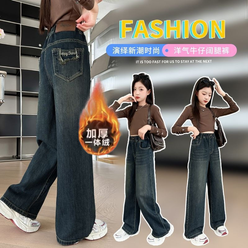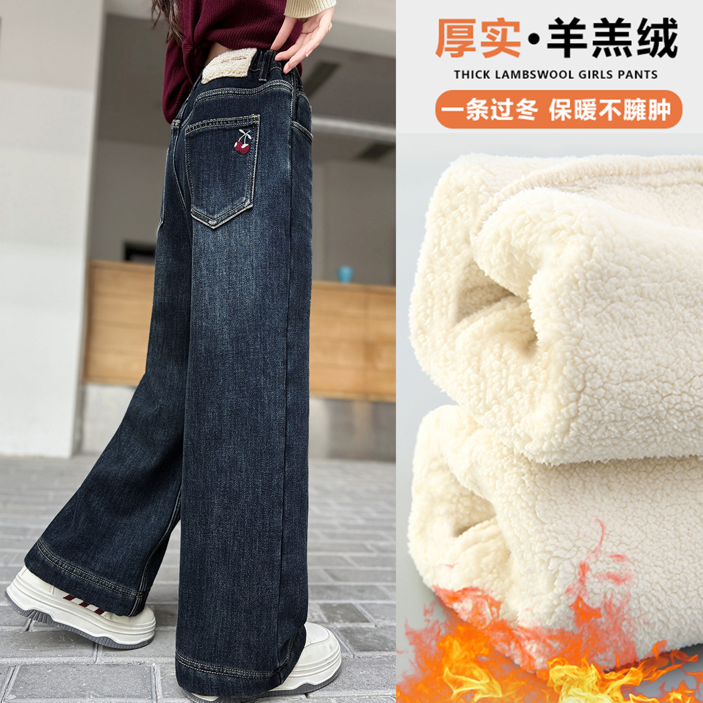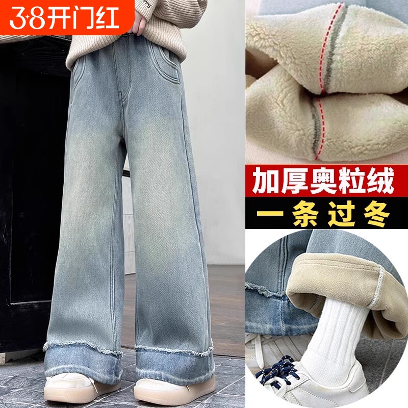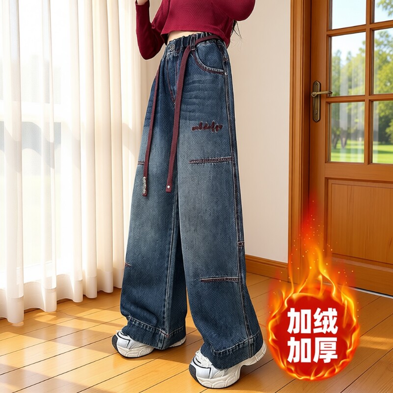 女童牛仔裤加绒冬季阔腿裤中大童加厚一体绒直筒裤子女孩长裤宽松