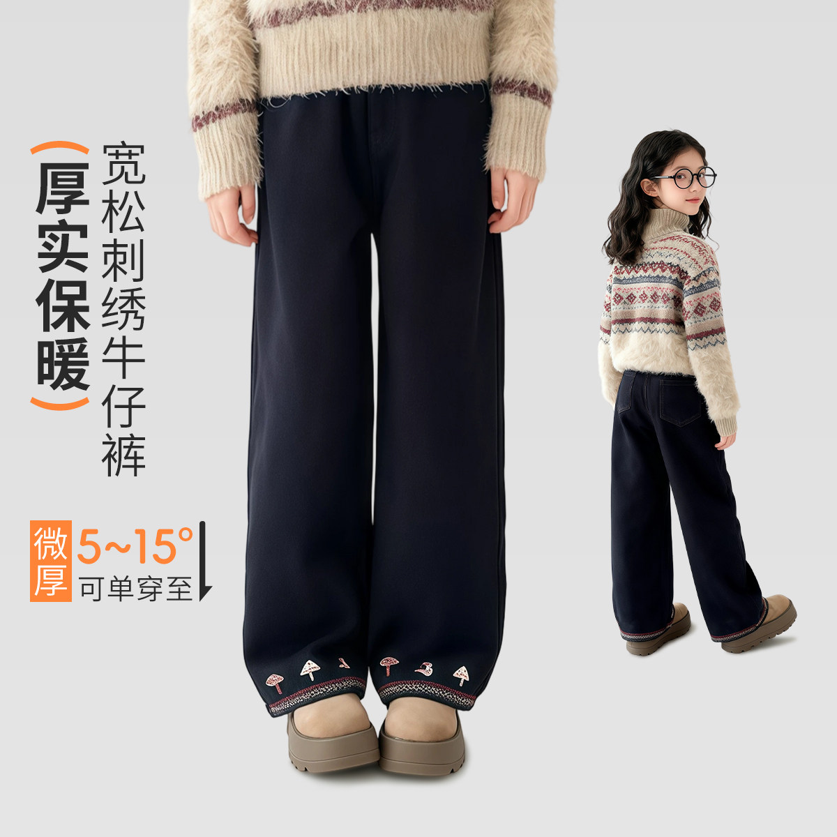 棉致女童加绒牛仔裤2026新款冬季一体绒加厚女大童阔腿裤儿童裤子