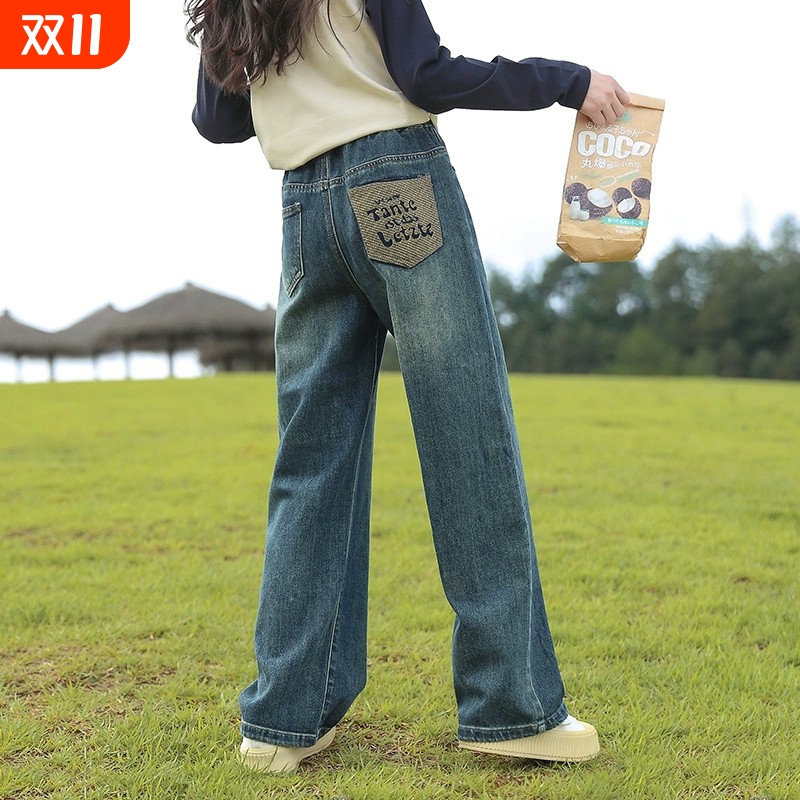 女童直筒牛仔裤新款儿童大童女孩阔腿春秋长裤初中生秋冬加绒加厚