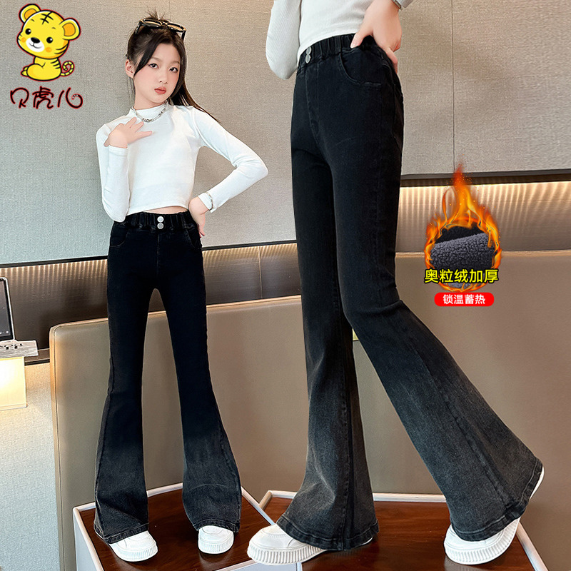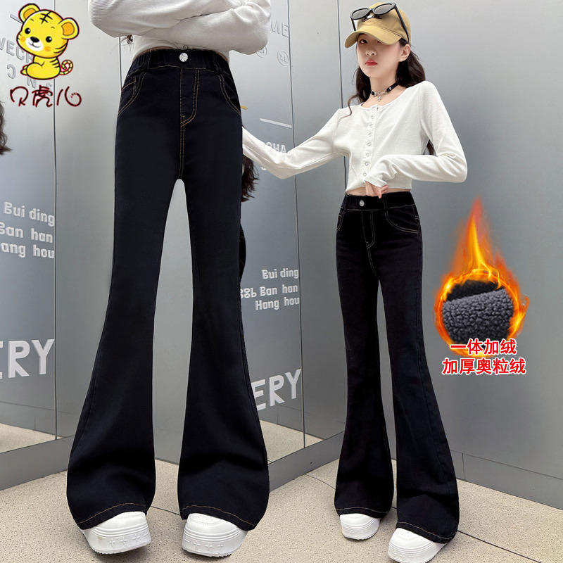 女童加绒喇叭裤冬季2025新款儿童裤子洋气秋冬加厚大童好看牛仔裤