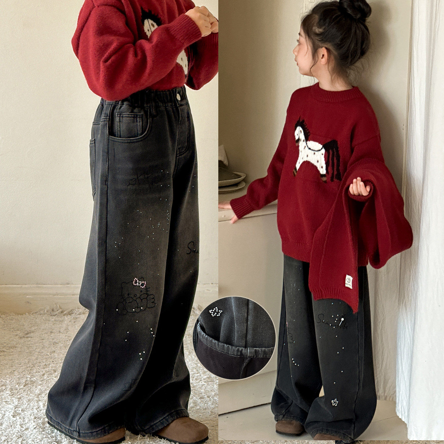 女童牛仔裤秋冬女大童阔腿裤冬天加绒加厚保暖裤子钻设计感直筒裤