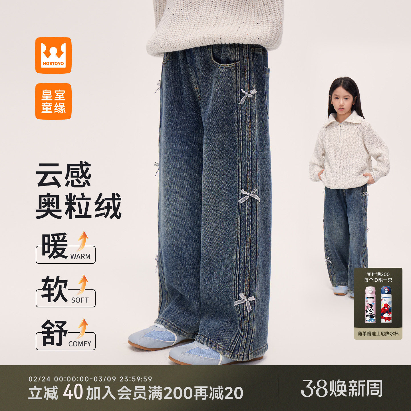 皇室童缘女童糯米牛蝴蝶结牛仔裤2025冬儿童加绒加厚阔腿裤中大童