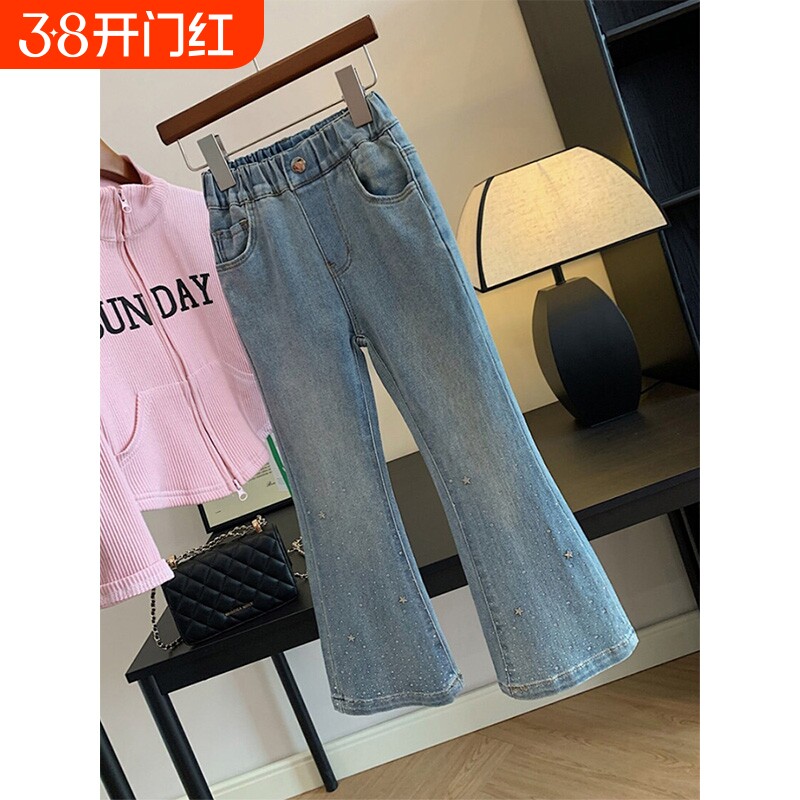 女童一体加绒牛仔裤儿童春秋冬季烫钻喇叭裤中大童洋气加厚微喇裤