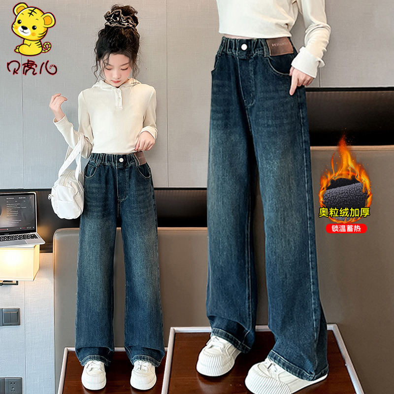 女童加绒裤子秋冬外穿2025新款中大童加厚阔腿长裤秋季儿童牛仔裤