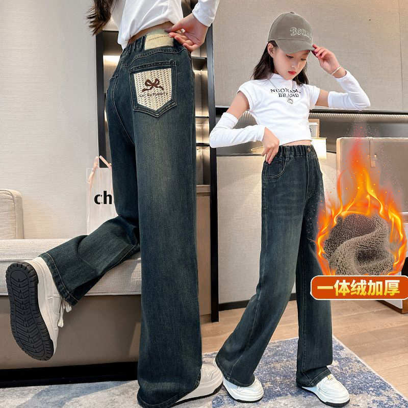 女童加绒裤子冬季新款儿童直筒牛仔裤加厚初中生女孩大童阔腿裤冬