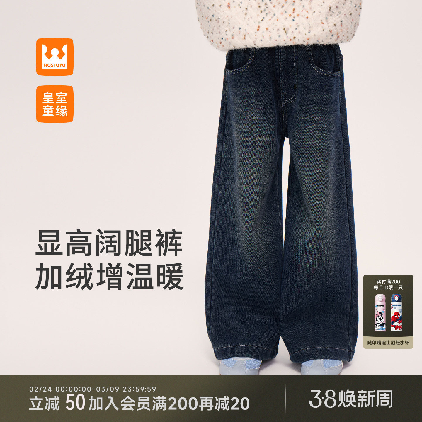 皇室童缘女童牛仔裤秋冬季2025新款儿童加绒加厚阔腿裤中大童长裤