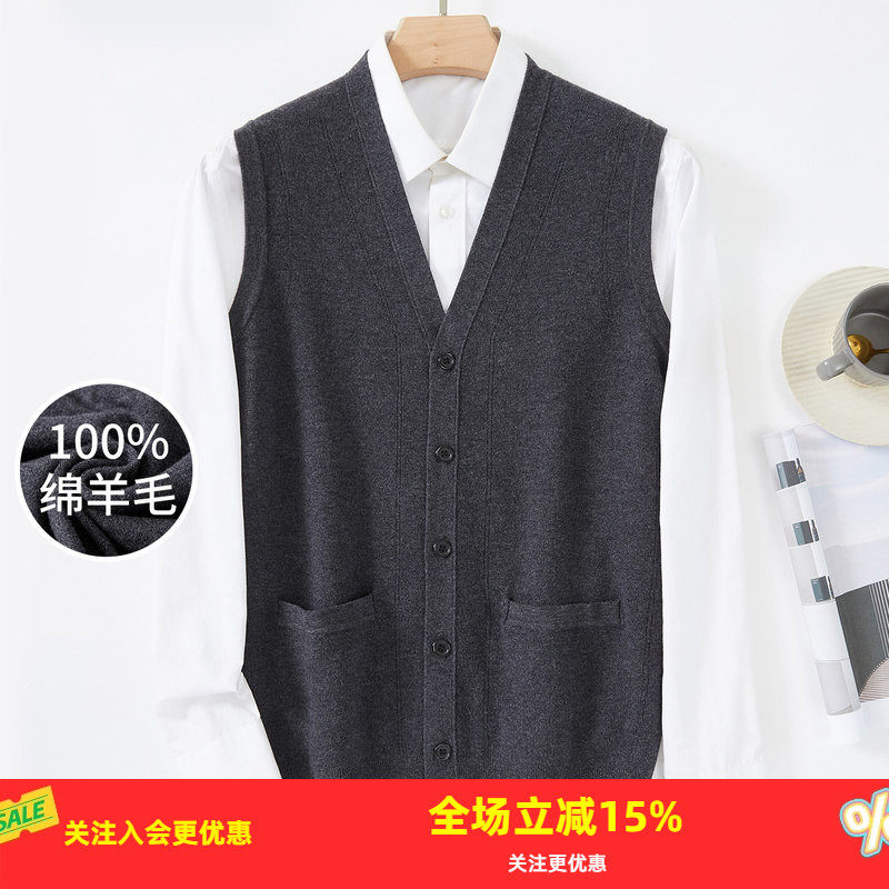 金菊【绵羊毛100%羊毛背心男士】秋冬新款V领无袖开衫男式羊毛衫