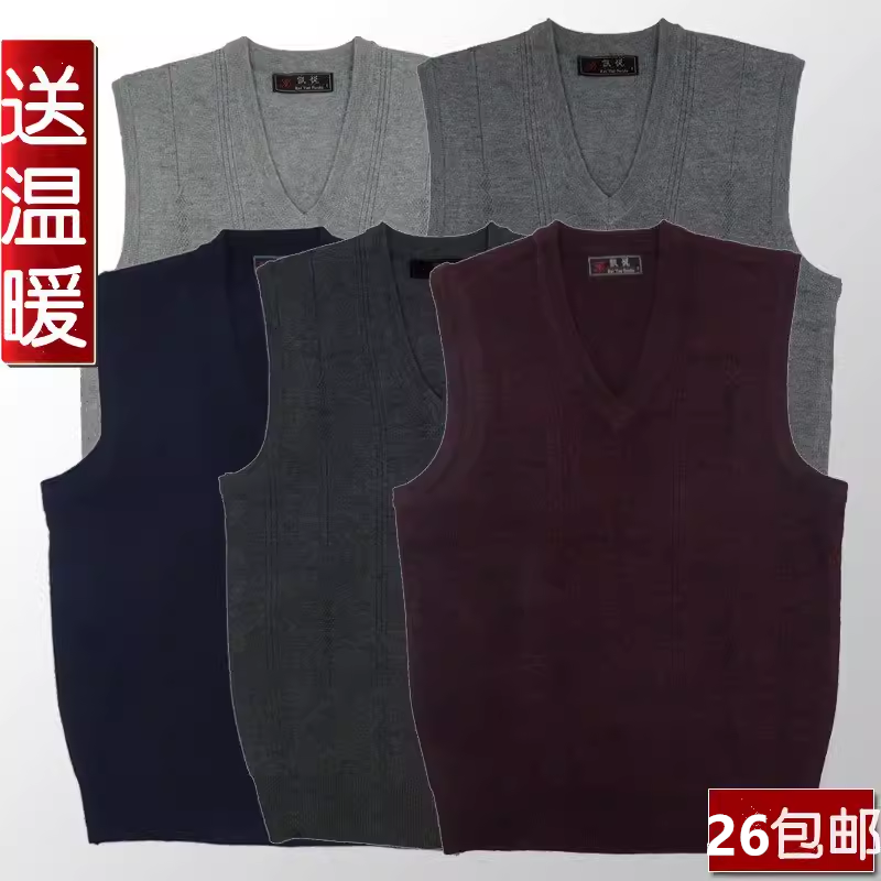 秋冬V领针织背心男式爸爸毛衣加厚男士含羊毛坎肩马甲毛背心中年