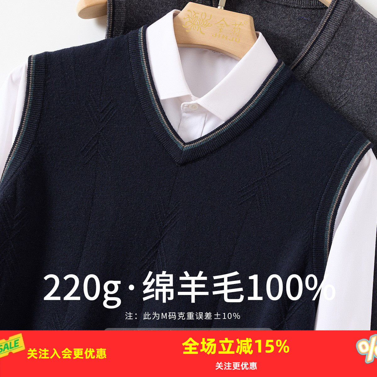 金菊36支3股【100%绵羊毛】25秋冬新款提花V领男式羊毛背心