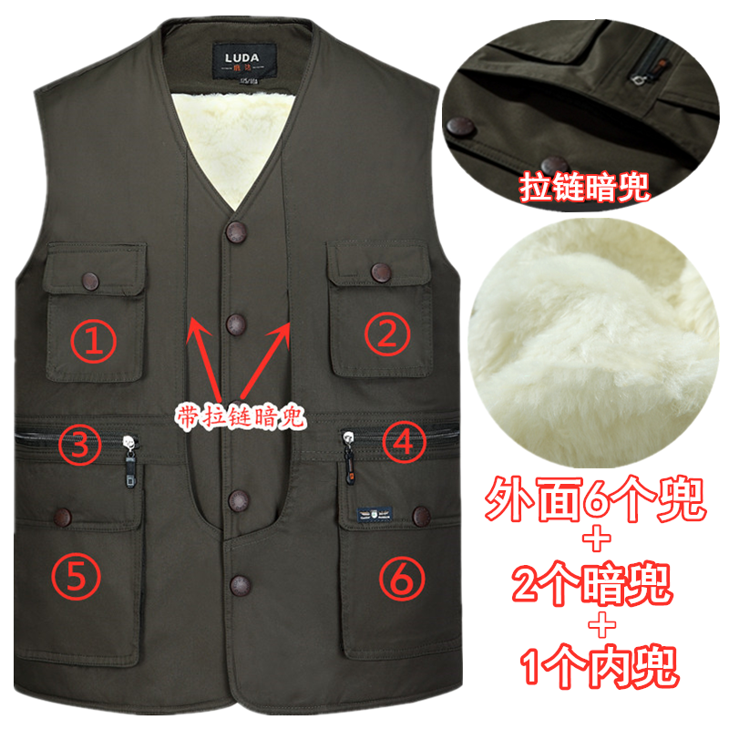 毛马甲冬季男式保暖加绒加厚背心中老年人坎肩加肥加大多口袋爷爷