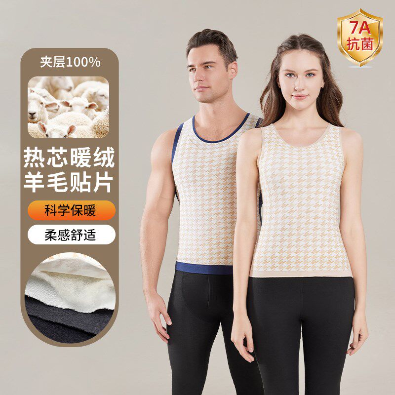 万拉小姐冬季新款纯羊毛填充贴片保暖背心男式女背心打底圆领无袖