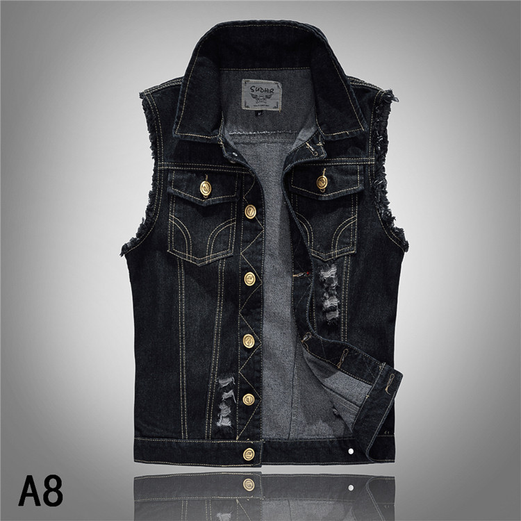 男式牛仔马甲大码黑色修身款潮流毛边破洞牛仔坎肩背心机车马夹男