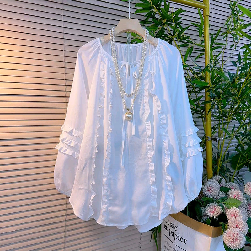 韩版大码女装系带蝴蝶结上衣2026春季新款半开领小衫显瘦花边衬衫