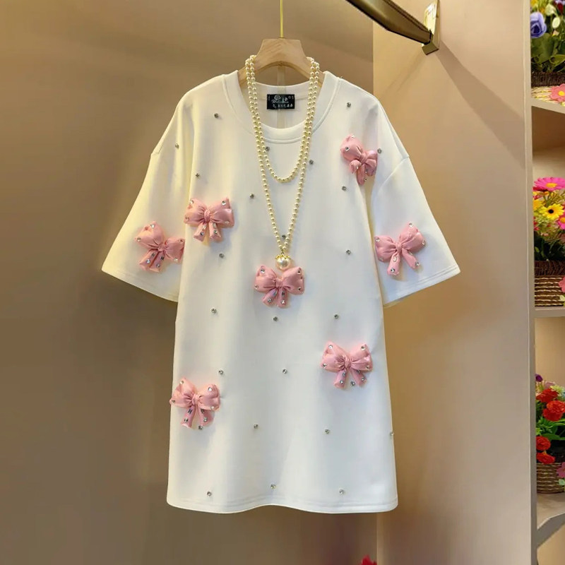 加肥女拼色蝴蝶结圆领短袖上衣胖妹妹甜美减龄韩版休闲百搭T恤衫