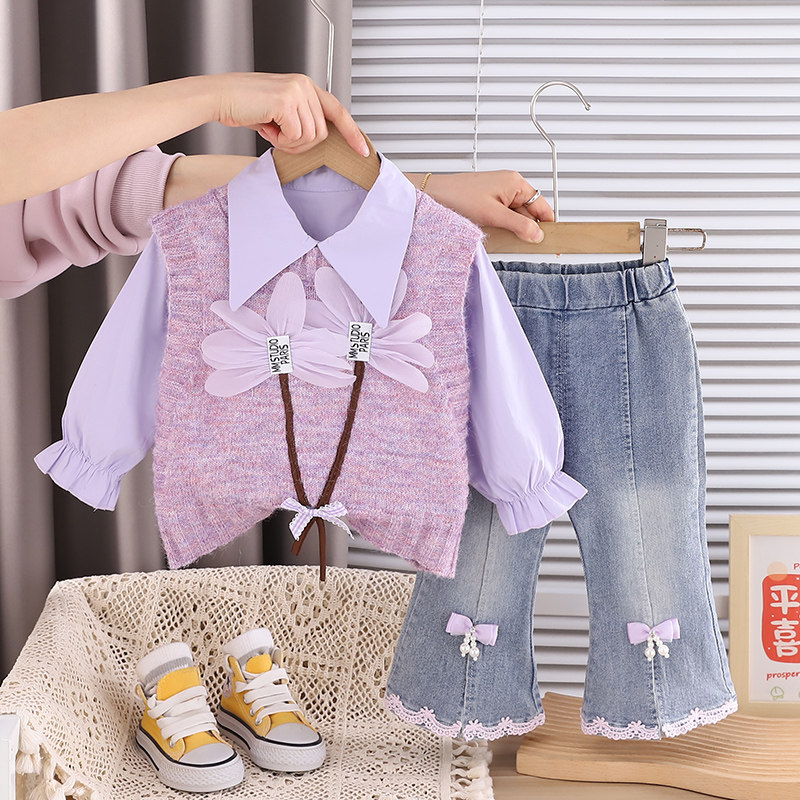 甜美风女童春秋季2026新款韩版百搭毛衣马甲衬衫三件套装蝴蝶结潮