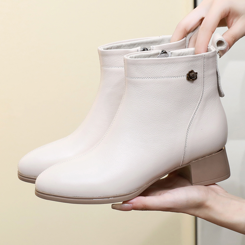 显瘦纯白色短靴粗跟真皮单靴2024女靴中跟马丁靴冬加绒棉靴跳舞靴