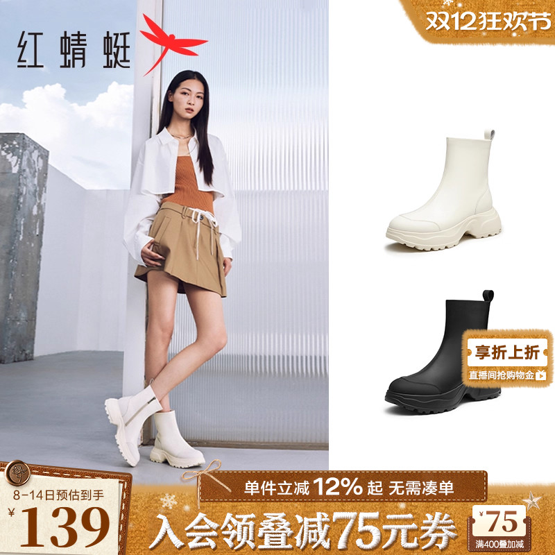 红蜻蜓白色小短靴女靴秋冬新款靴子皮鞋加绒弹力靴法式粗跟瘦瘦靴