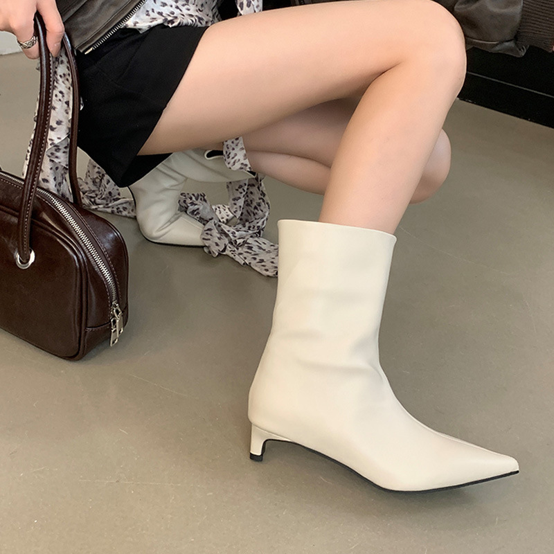 法式小短靴尖头短靴女2024年秋冬新款女靴白色跟靴子女细跟中筒