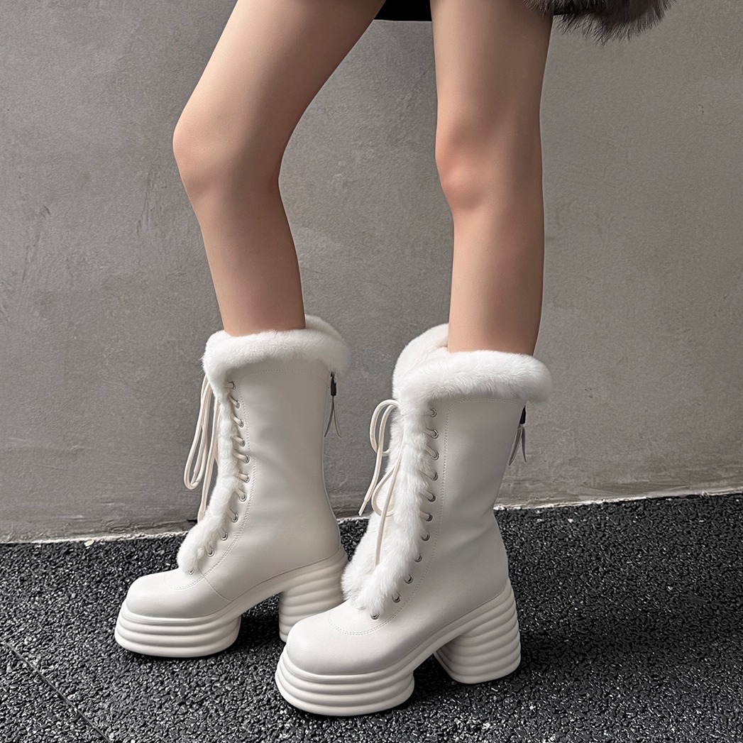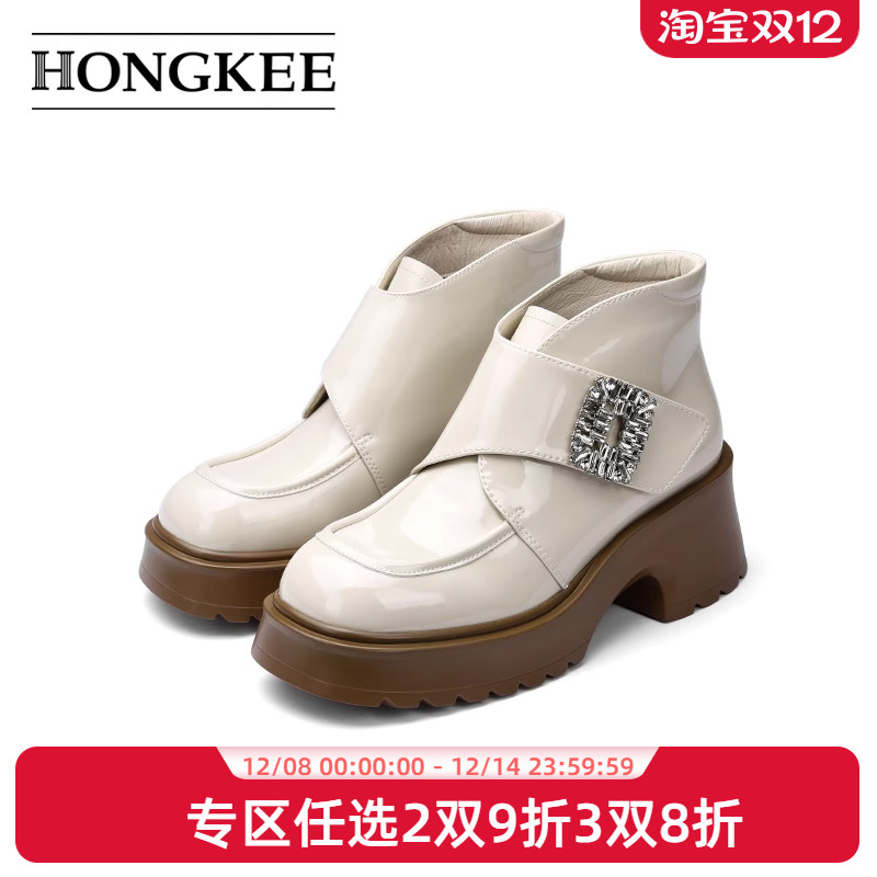 Hongkee/红科短靴2023秋冬新款女鞋优雅厚底粗跟女靴白色HA53S406