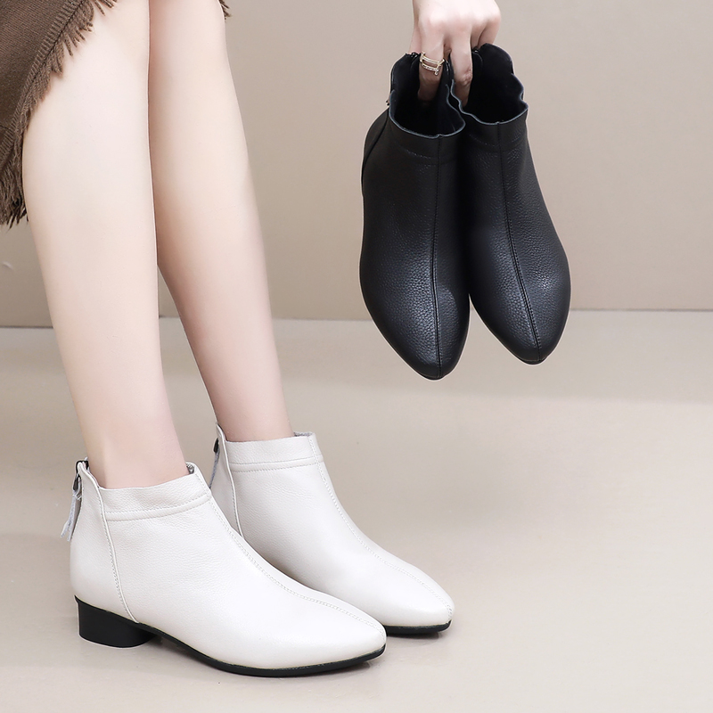 百搭全牛皮踝靴子春秋女靴白色小香风低跟短靴软底防滑马丁靴加绒
