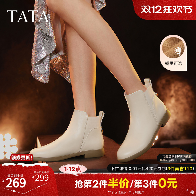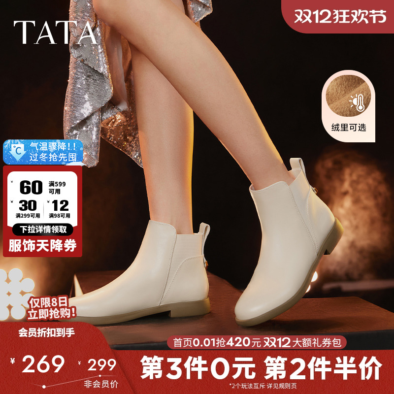 TATA他她法式通勤短靴女靴白色加绒牛皮踝靴子单靴秋冬新7BJ44DD3