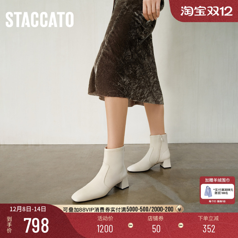 思加图新款方糖奶油白色短靴粗跟增高时装靴女靴9U004DD4