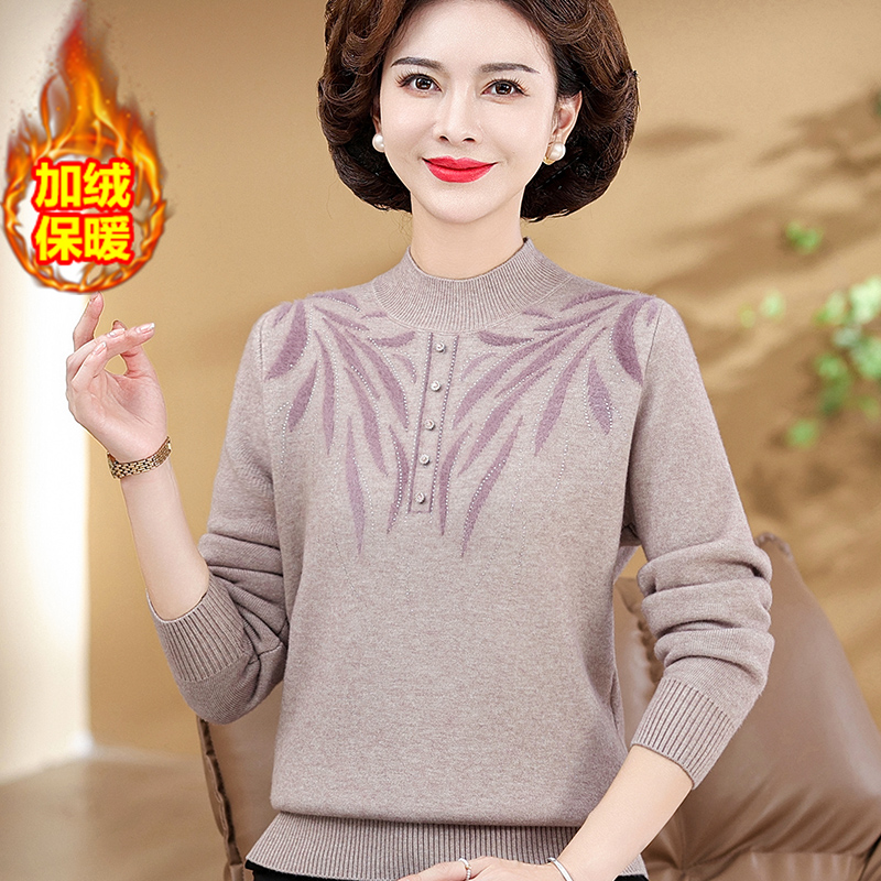 妈妈秋冬季加绒加厚毛衣洋气一体绒保暖上衣中老年冬装绣花打底衫
