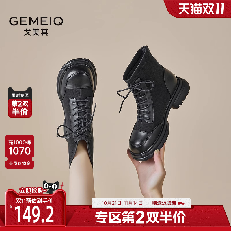 戈美其粗跟马丁靴女2025冬季新款系带短筒瘦瘦靴英伦风厚底短靴