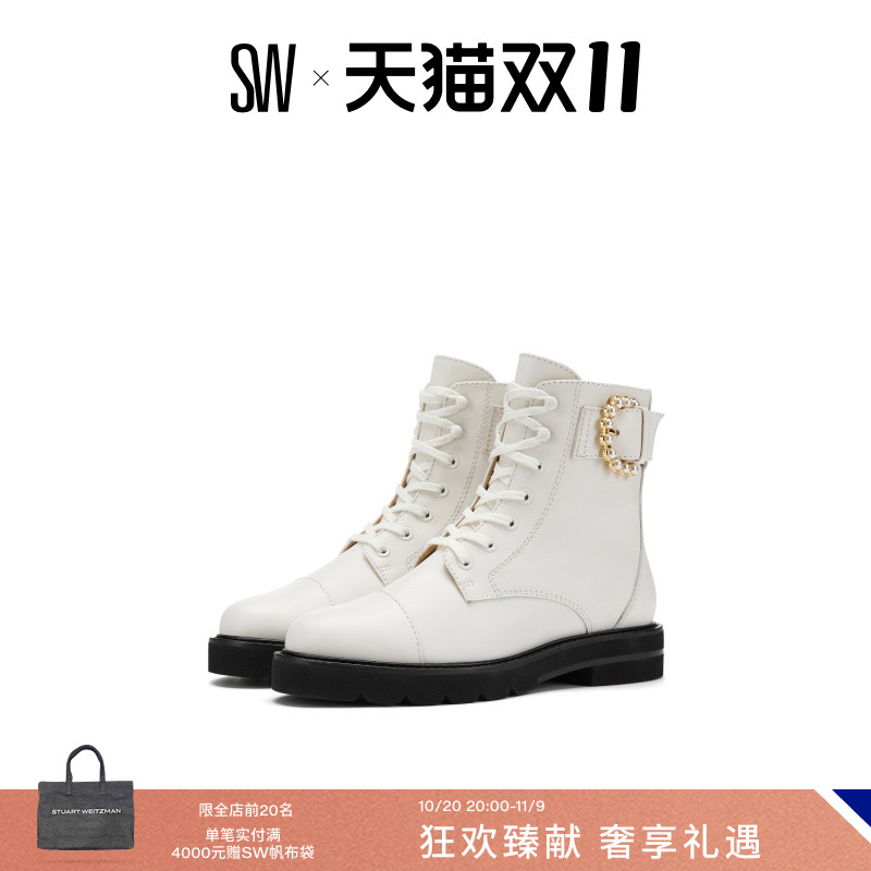 SW PIPER LIFT BOOTIE 秋冬季珍珠扣粗跟短靴系带圆头马丁靴女