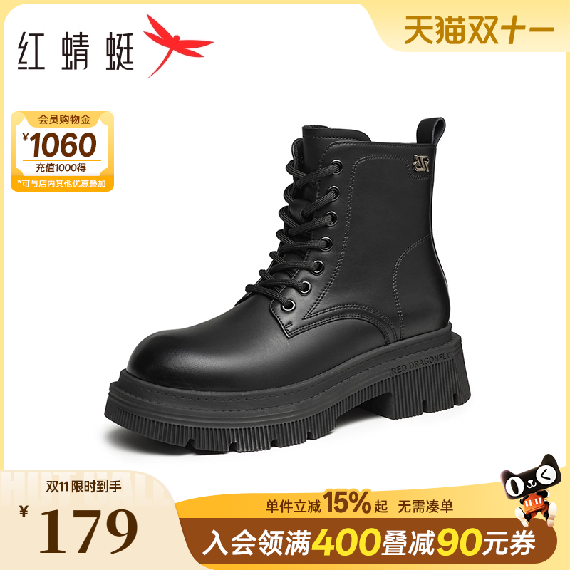 红蜻蜓马丁靴女冬季新款女鞋增高短靴系带粗跟机车靴英伦通勤单靴