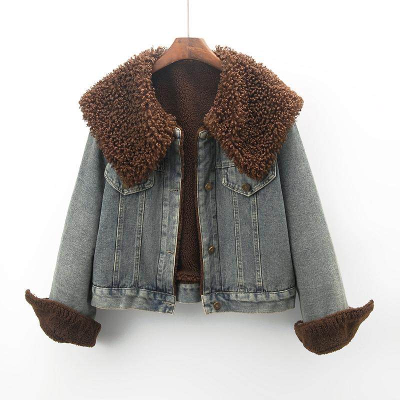 高端欧货冬季新款加厚复古毛毛牛仔外套小个子短款气质保暖外套女