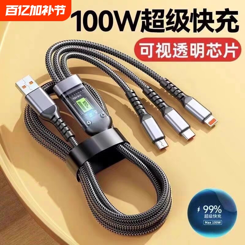 120W数据线充电线三合一快充手机通用正品适用苹果华为vivo小米一拖三6a编织头车载多功能便携typec