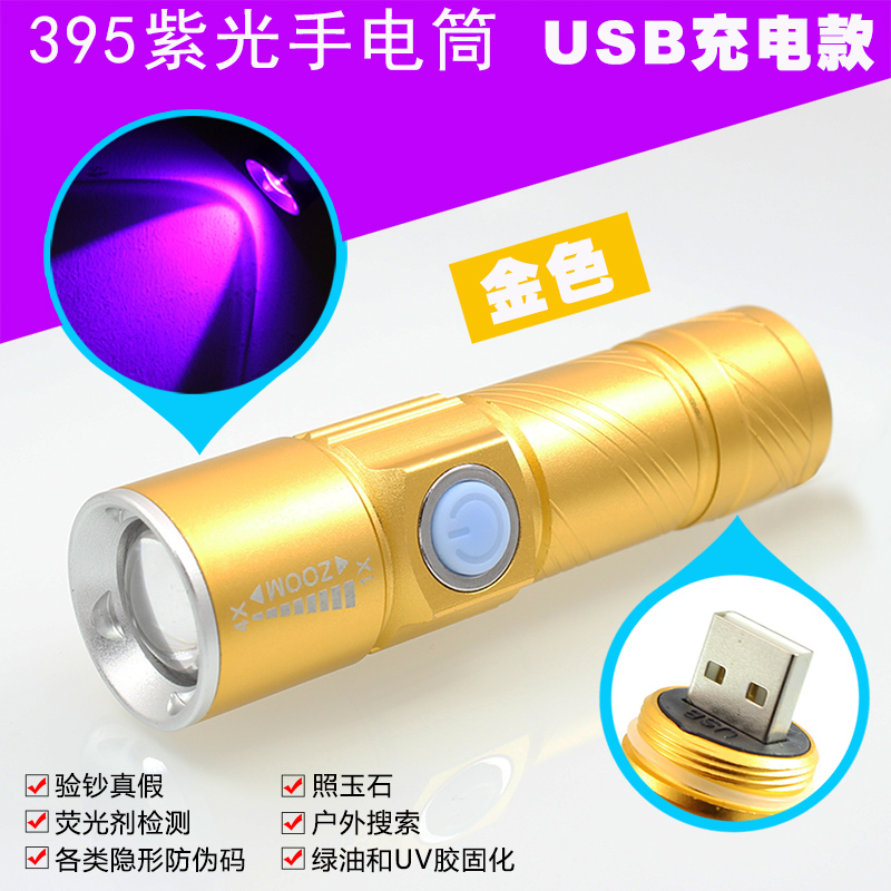 USB充电手电筒荧光剂检测笔防伪码紫光灯验钞紫外线玉石鉴定365nm