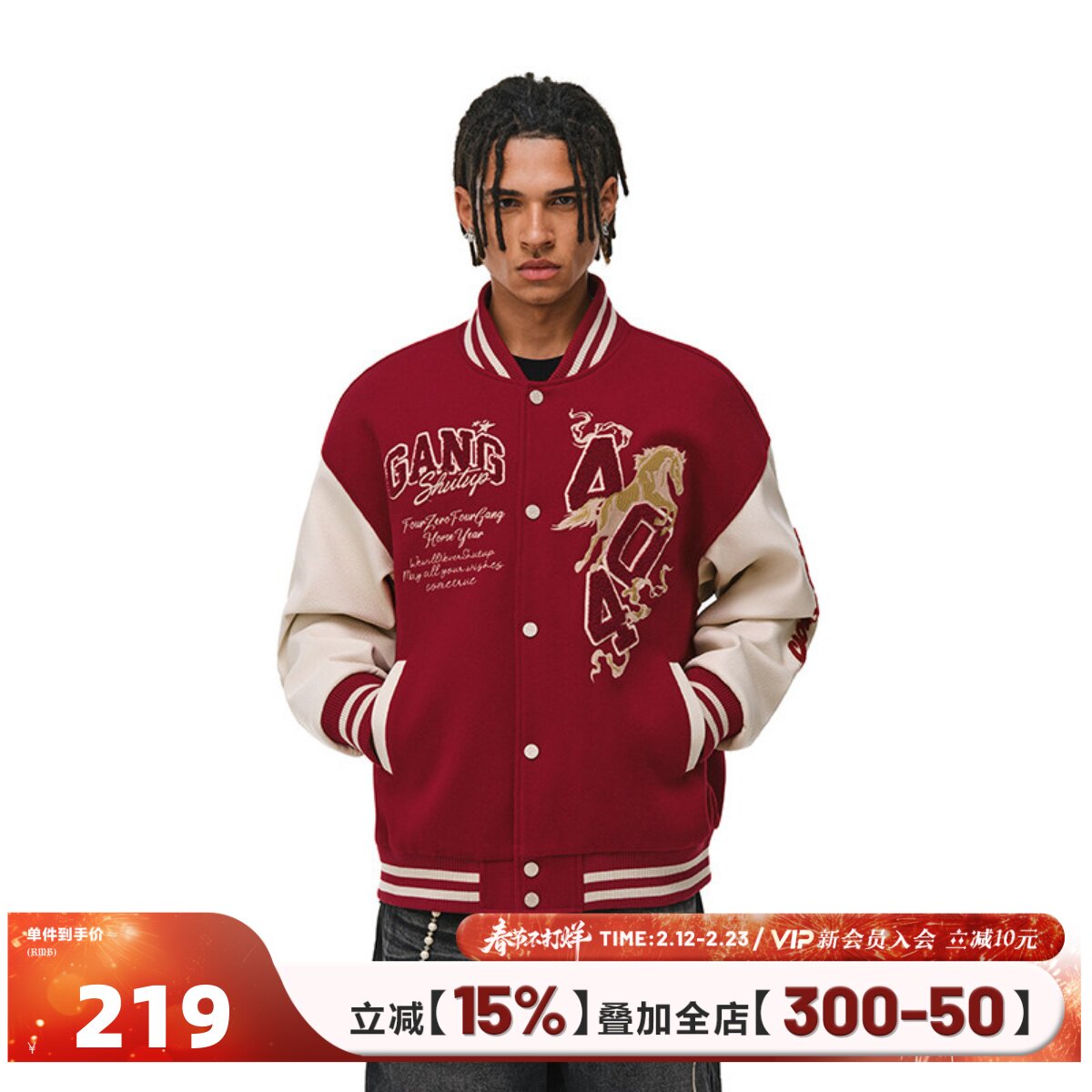 404MOB马年2026夹棉加厚毛巾绣红色棒球服男女美式宽松情侣外套潮