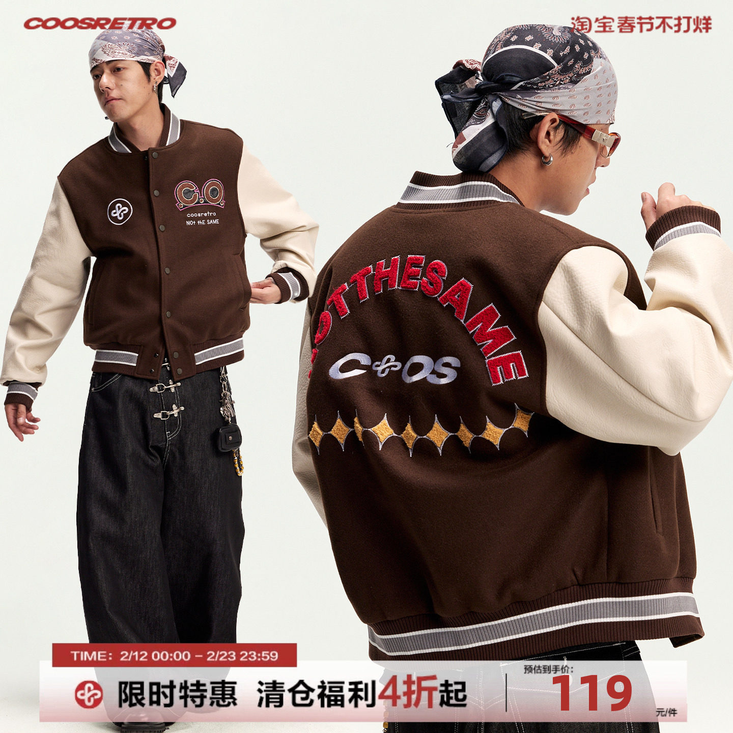 CoosRetro 皮袖拼接加厚棒球服男宽松刺绣夹克休闲百搭外套潮流