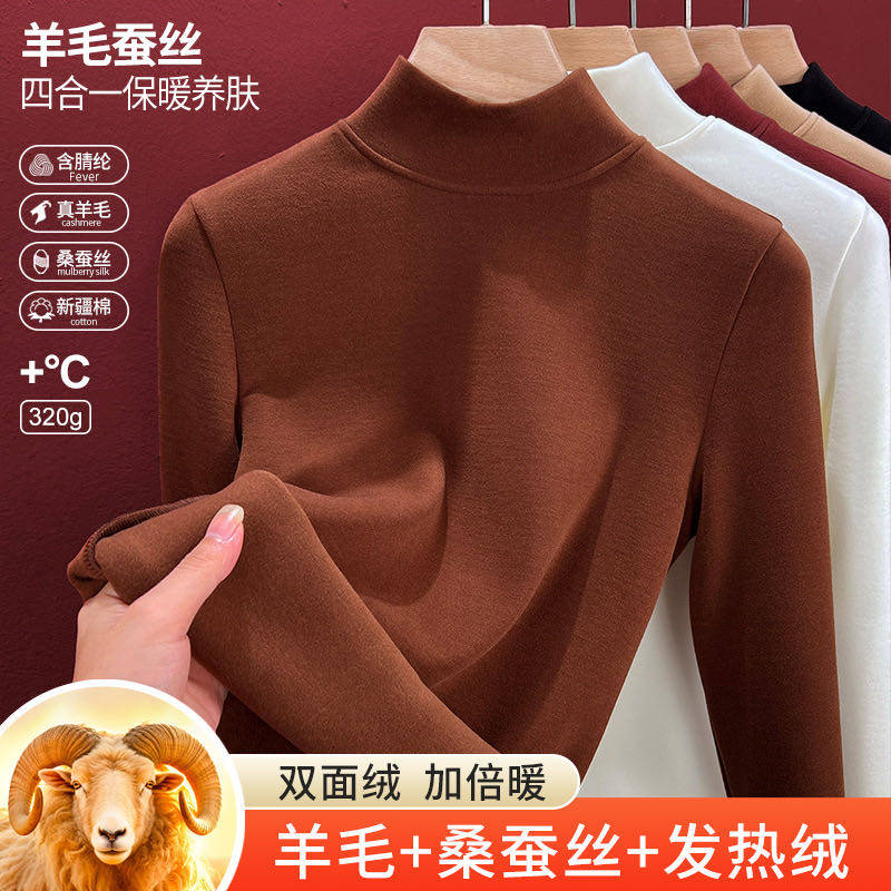 秋冬季蚕丝羊绒双面德绒半高领打底衫女加绒加厚保暖洋气长袖上衣