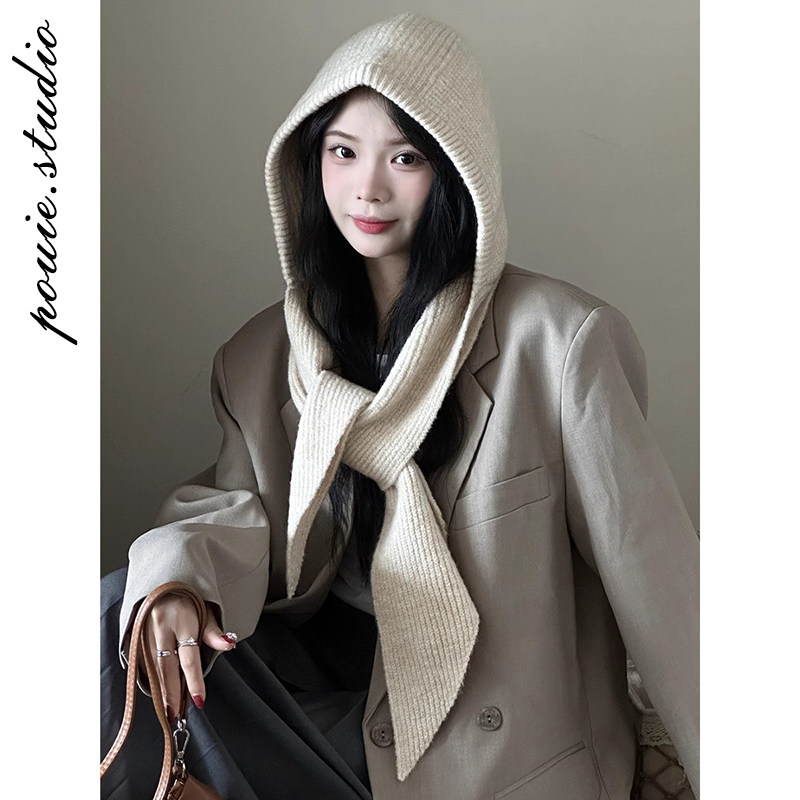 2025秋冬季新款纯色针织帽子披肩一体女两用外搭加厚保暖护颈围脖