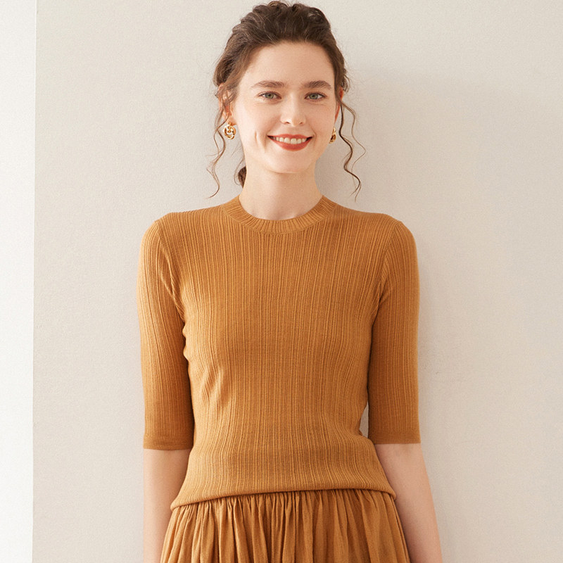 半高领桑蚕丝羊毛针织五分袖女斜纹提花短袖T恤宽松中袖打底上衣