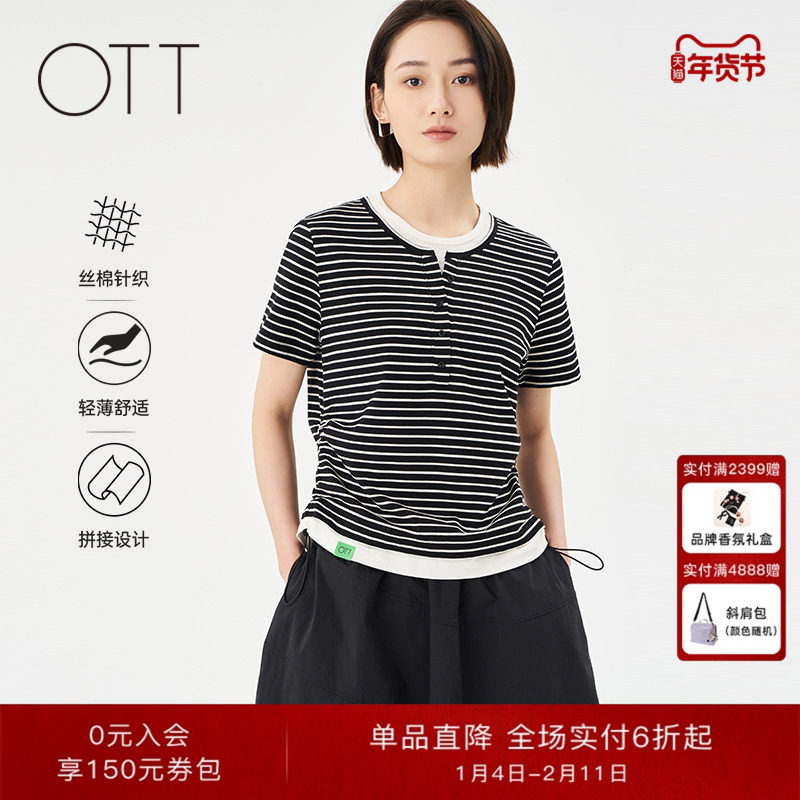 OTT桑蚕丝棉假两件T恤条纹新款女百搭显瘦抽绳设计短袖上衣短T