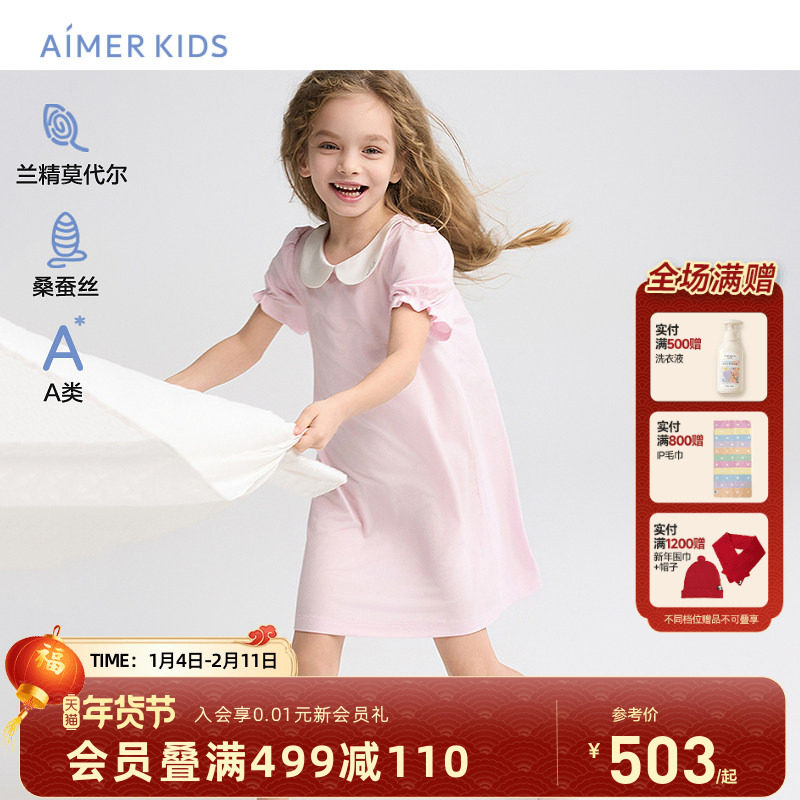 爱慕儿童桑蚕丝短袖女童家居睡裙A类夏季柔软中小学生娃娃领外穿