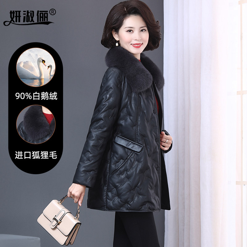 海宁中老年真皮羽绒服女冬季新款中长款大码修身妈妈装皮衣外套厚